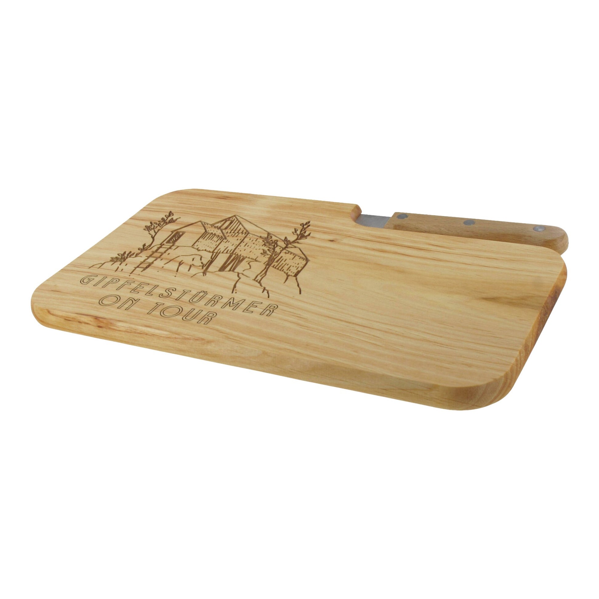 cooles Brotzeitbrett "GIPFELSTÜRMER ON TOUR" aus massivem Erlenholz (geölt) inkl. Speckmesser mit Holzgriff