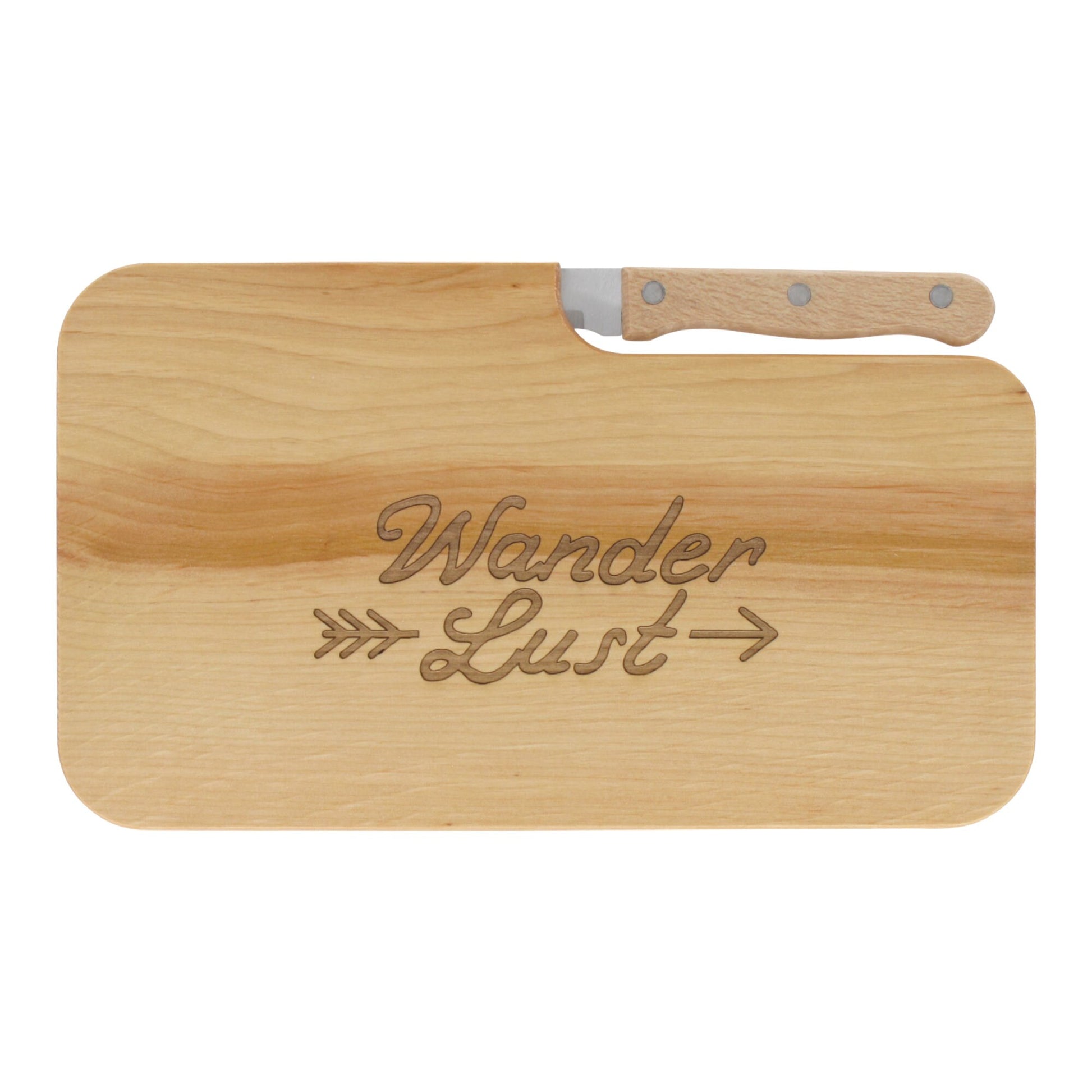 cooles Brotzeitbrett "WANDERLUST" aus massivem Erlenholz (geölt) inkl. Speckmesser mit Holzgriff